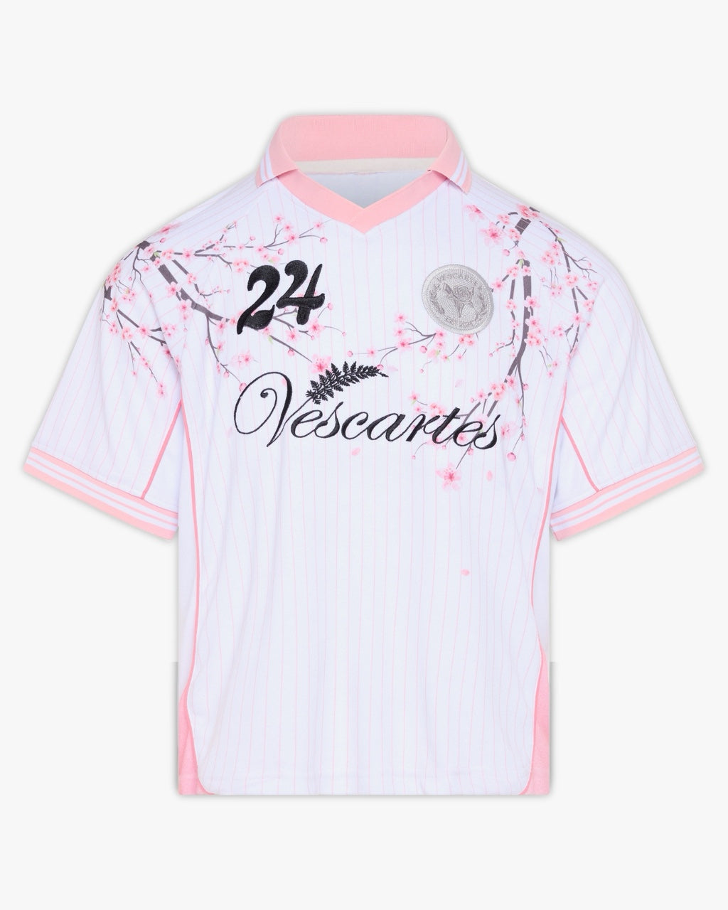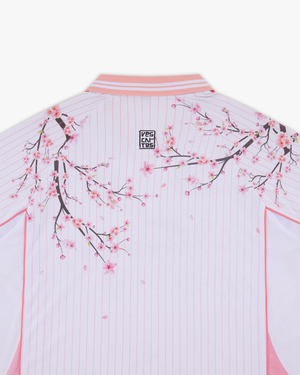 Features fine pink pinstripes running across all panels and printed cherry blossom branches running down from the shoulders over the front and back. contrasted by a pastel pink collar and sleeve trim. Finished with embroidered 'Vescartes' brand logos on the front and back.