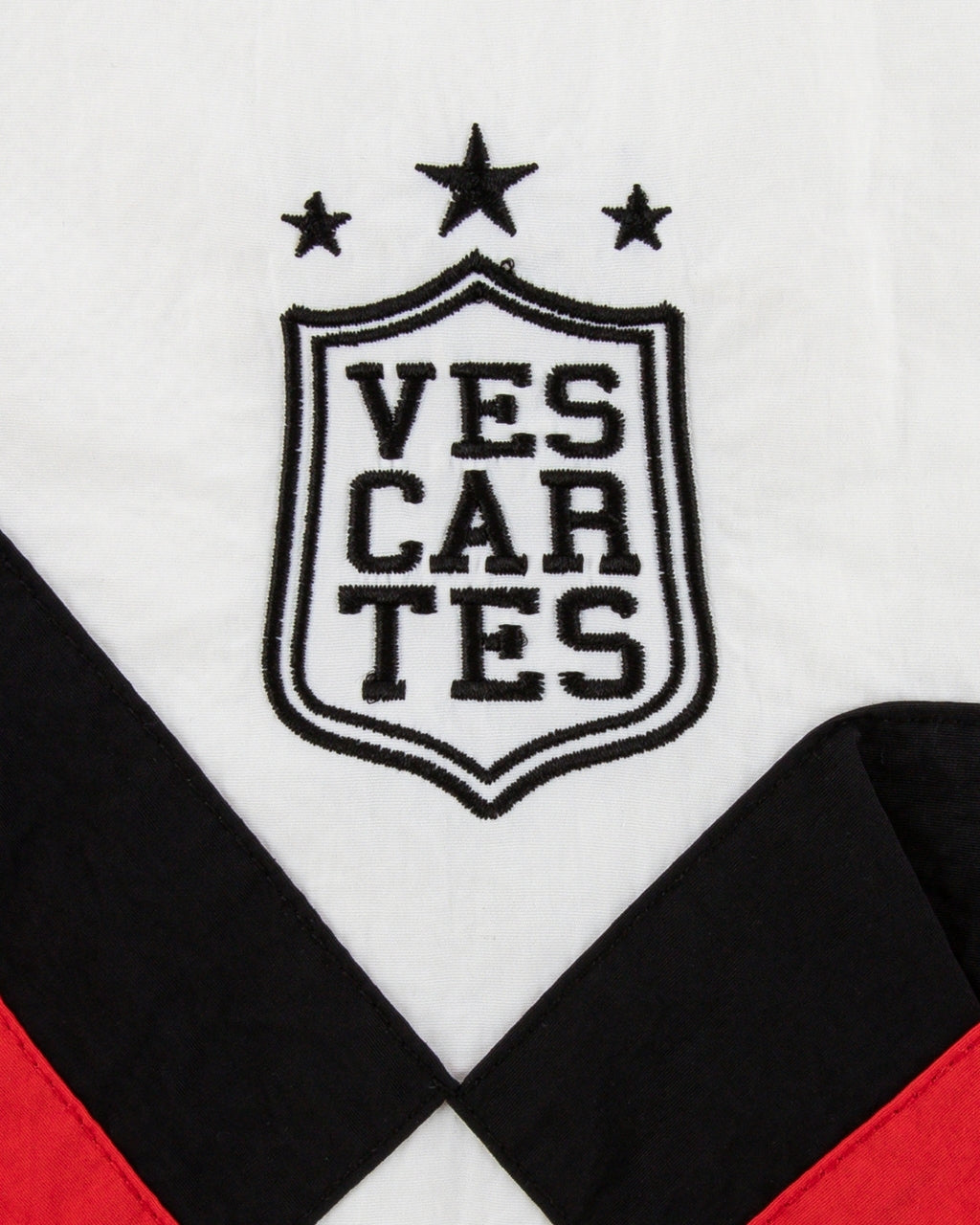 Drawing from the heritage of German football, this jacket fuses nostalgia with contemporary design. A tricolour ribbon motif arcs across the chest and sleeves, while the dual crests subtly reinterpret classic football emblems through the Vescartes identity.