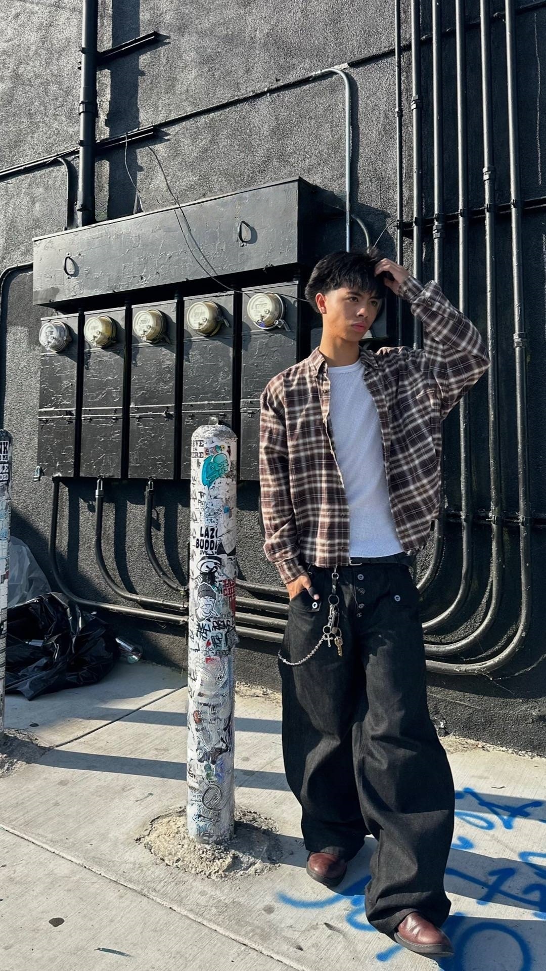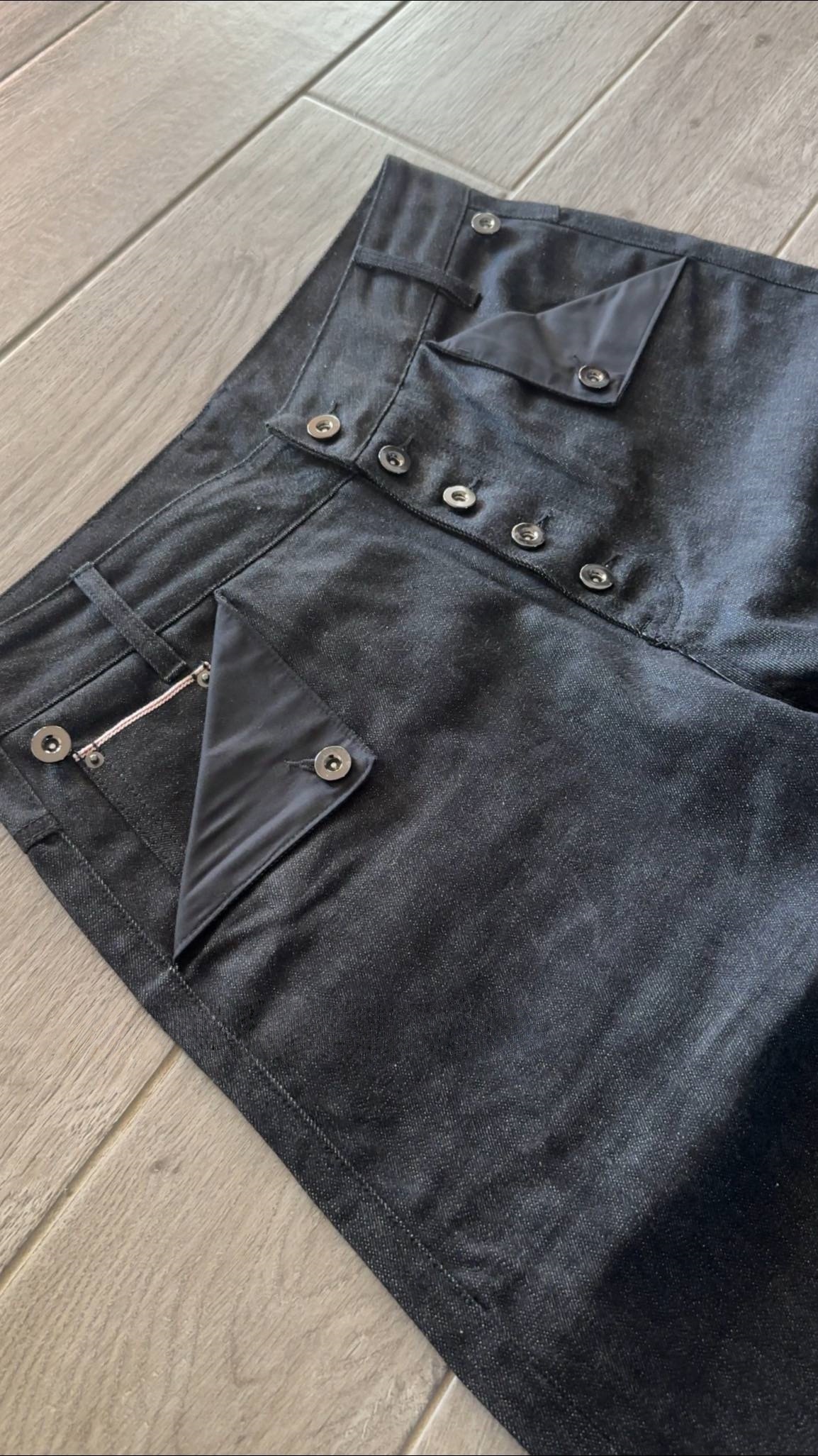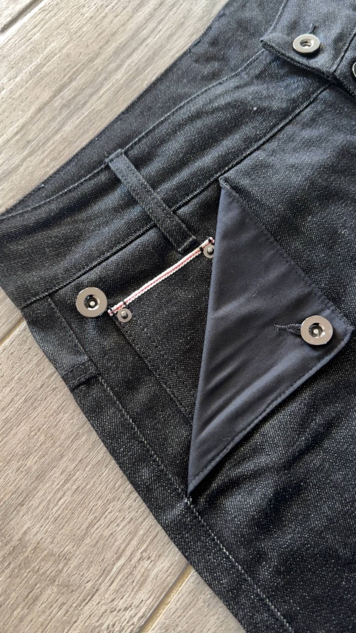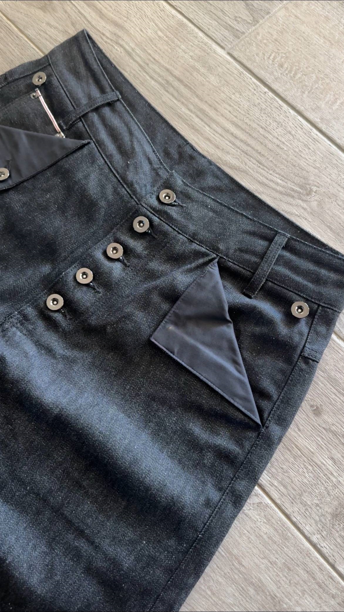 • Pocket Details: The front pockets are decorated with triangular contrast fabric panels (featuring a sleek texture, possibly nylon) and metal hardware accents, adding an edgy and modern touch to the classic denim style.