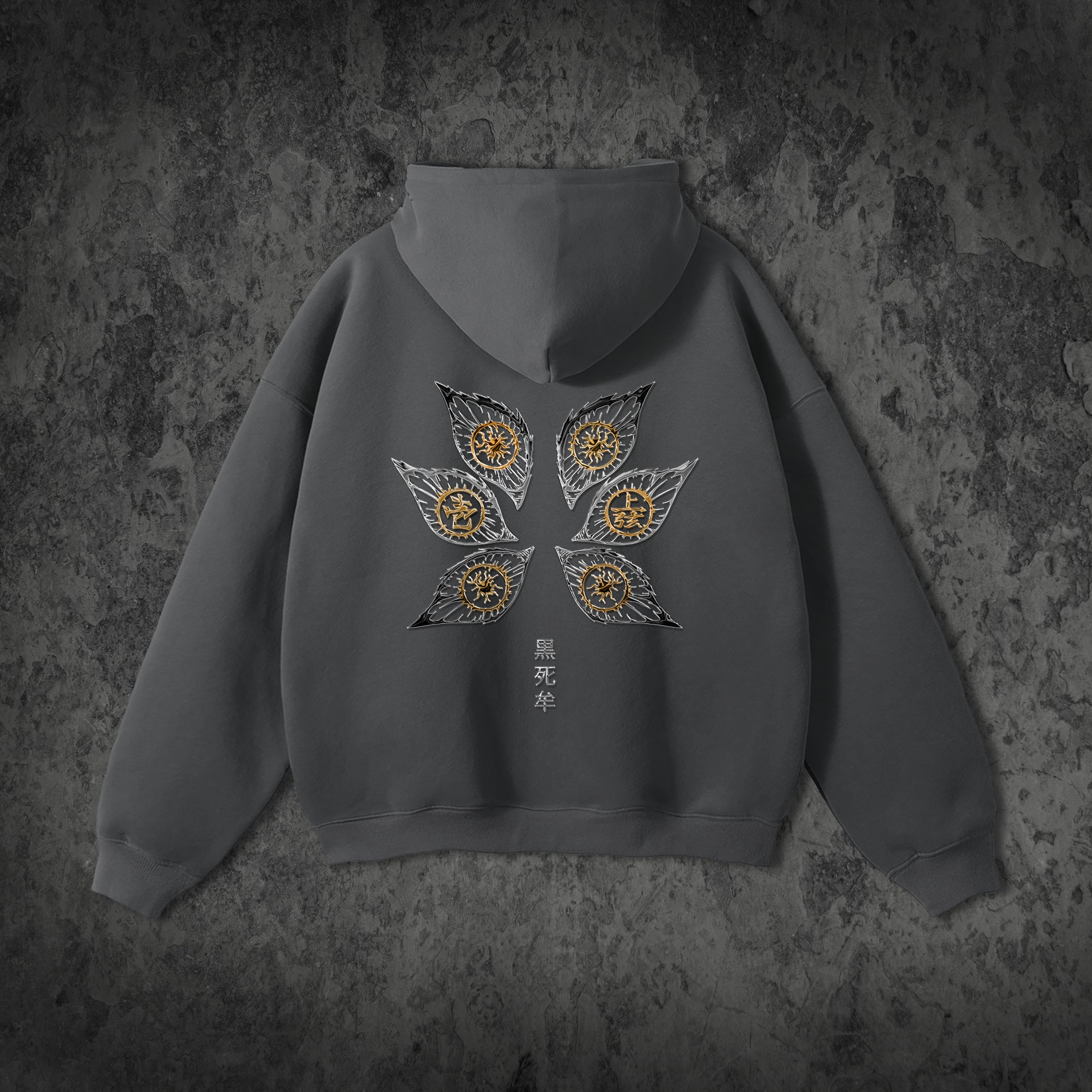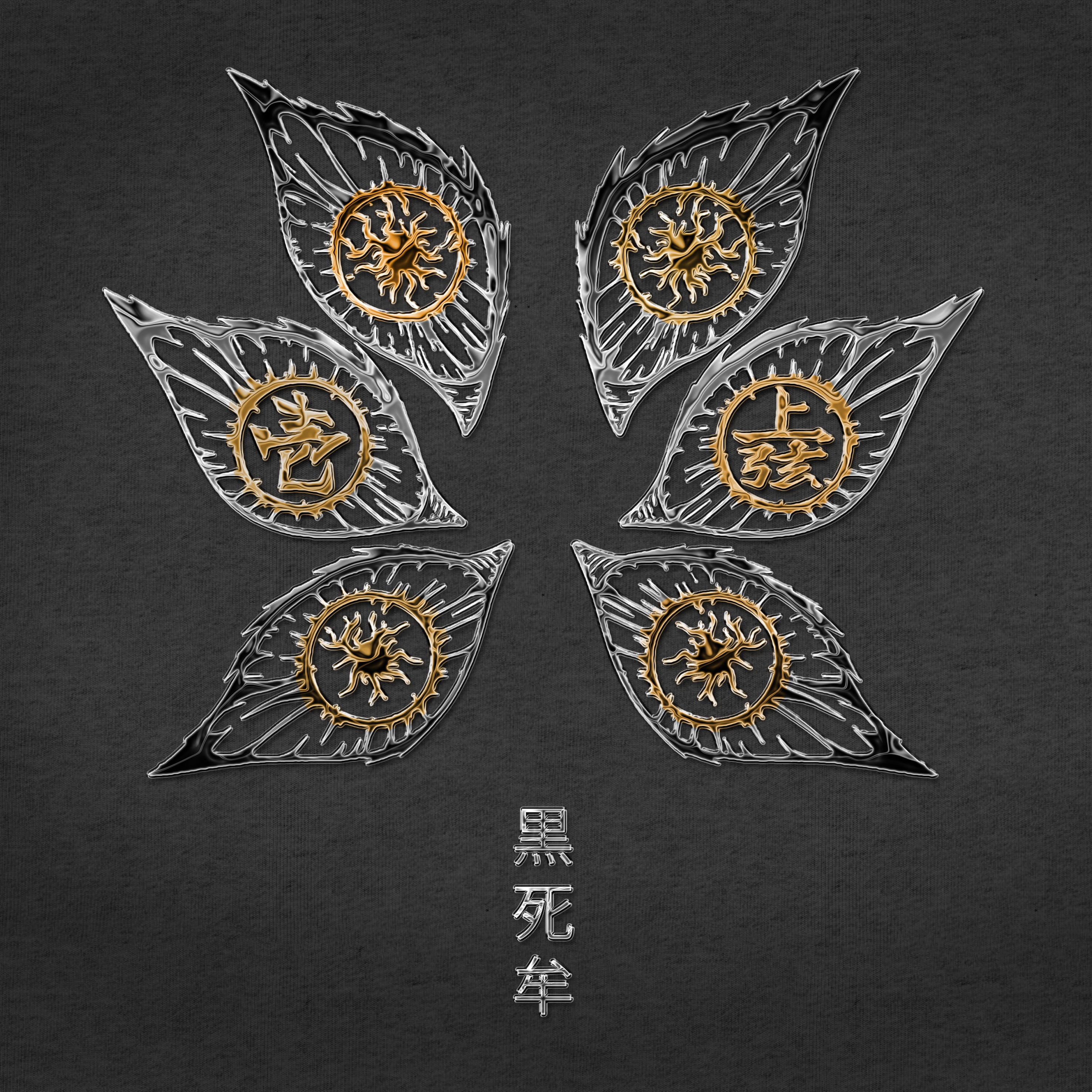 Blending metallic textures with sharp detailing. Each eye is framed by chrome-flame jagged, flame-shaped outlines in chrome tones, symbolizing both chaos and control. The intricate golden iris designs mirror Kokushibo’s supernatural vision, while the kanji 黒死牟 ("Kokushibo") grounds the piece in raw, mythic energy.